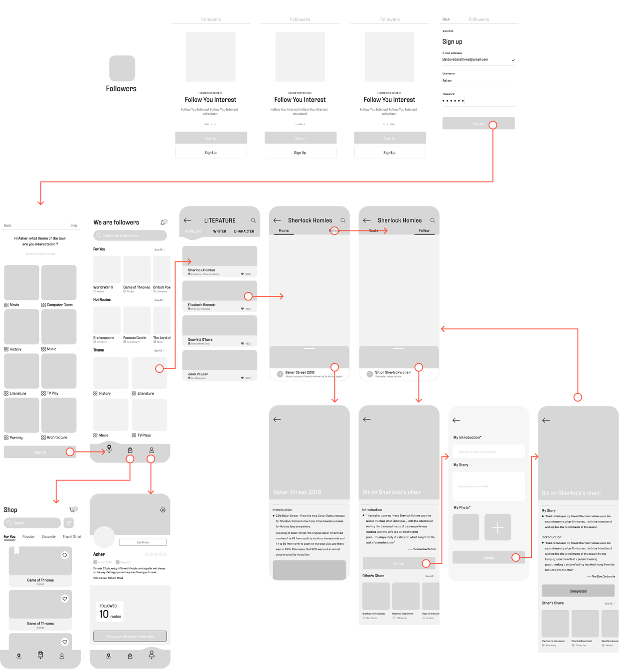 After the information architecture was completed, I moved onto the wireflow to showcase spacing and layout.